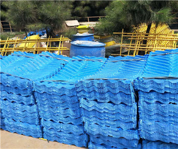 因為填料在運(yùn)到場地時都是成卷或者成片的,找一個足夠放置冷卻塔填料的空白場地,把填料按客戶要求尺寸,用PVC膠水粘成有規(guī)則的長方形單元或者與冷卻塔相配的形狀。