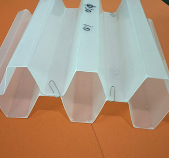 1、打開斜管填料包裝,將片斜管填料平放于地面,取第二片斜管填料置于片填料之上,檢查斜管填料的切口,必須保證60°角、并呈六角蜂窩狀,檢查無誤后開始燙接粘接點;
